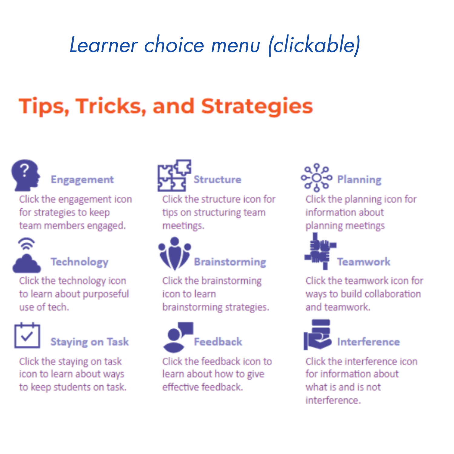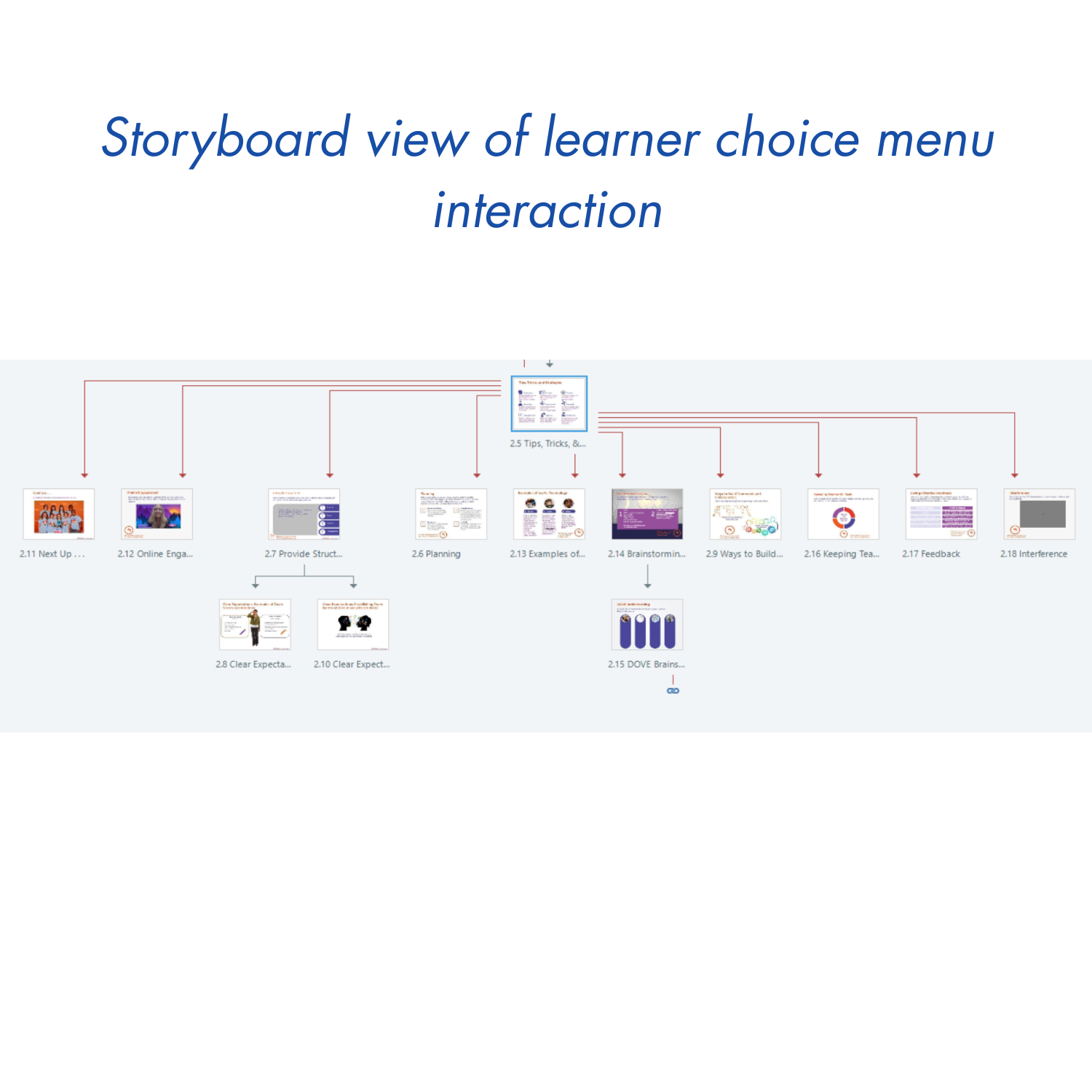 In Spring 2020, I designed, developed, and implemented an eLearning course to help DICO Team Managers rapidly transition from a fully in-person management model to leading teams in a fully virtual environment.