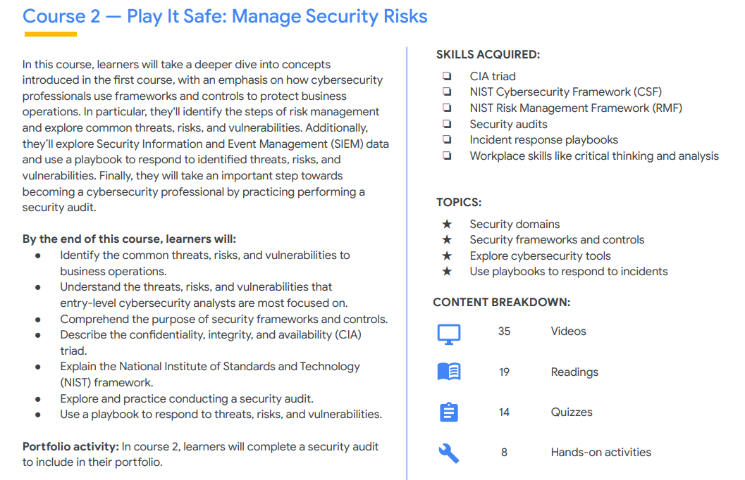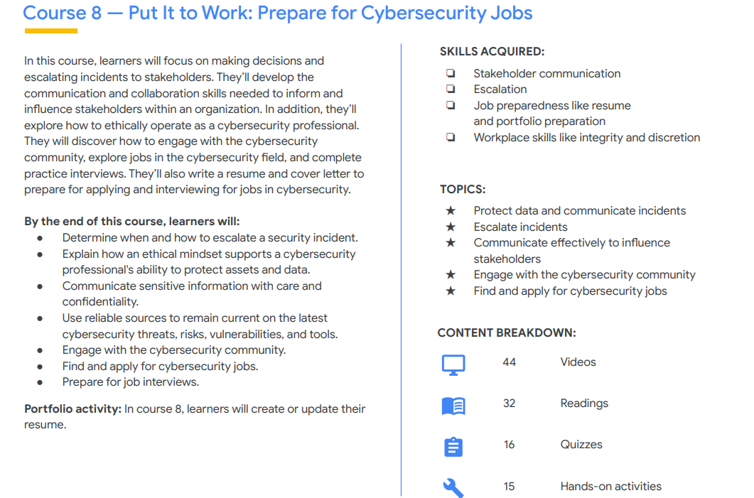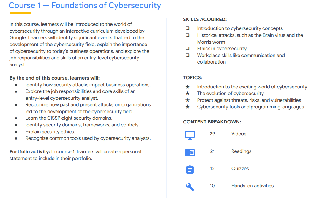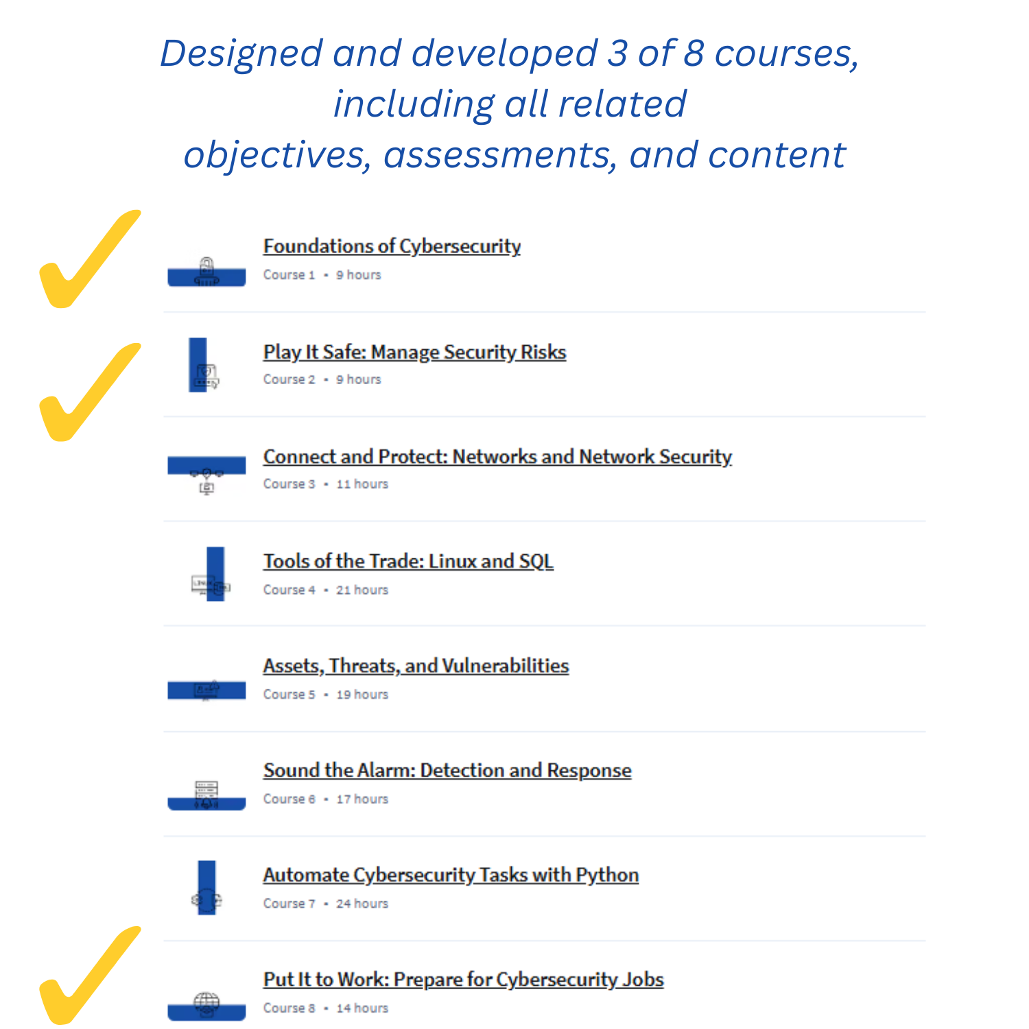 From the beginning of 2022 to 2024, I helped design, develop, launch and maintain Google’s Cybersecurity Certificate, which was created for a global audience of learners with no previous knowledge of or experience in the cyber field.